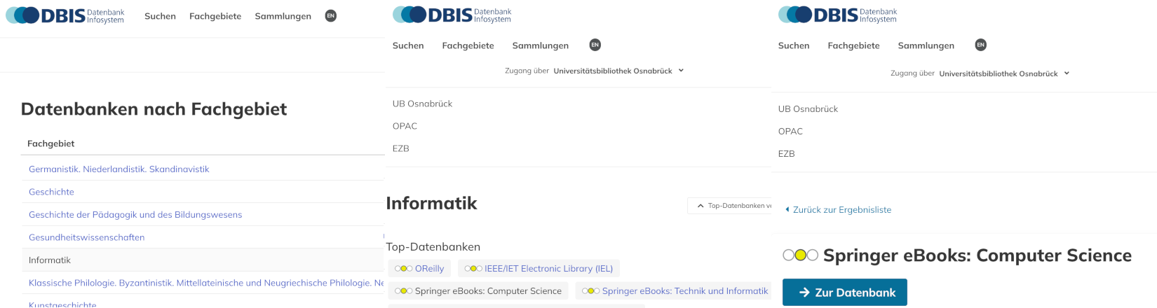 Auf der DBIS-Seite wird aus der angezeigten Fachgebietsliste "Informatik" selektiert, auf der Folgeseite bei den Top-Datenbanken "Springer eBooks: Computer Science" gewählt und auf der nächsten Seite der Button Zur Datenbank gewählt.