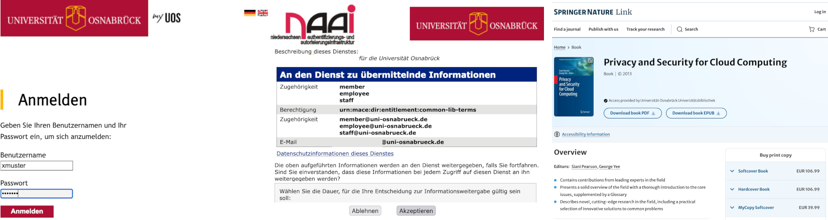 Nutzer eines Webdienstes mit integriertem Shibboleth können sich dabei mit ihrer Universitäts- bzw. Hochschulkennung anmelden und erhalten so auch von außerhalb der Universität Zugang zu lizenzierten elektronischen Ressourcen, wie sie u. a. die Universitätsbibliothek anbietet. Nachfolgend wird beschrieben, wie der fiktive Student der Universität Osnabrück Xaver Muster auf die "Springer Nature Computer Science eBook Collection" zugreift, die u. a. eine Shibboleth-Anmeldung anbietet.